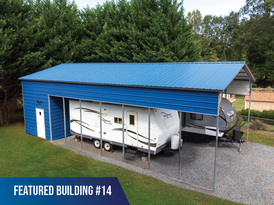 We carry a full line of Carports, Garages, Sheds, Barns, RV Ports, Enclosed Buildings and Green / Grow Houses.